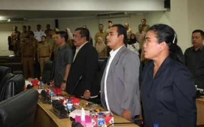 | Pimpinan DPRD dan Sekda Kab Kampar saat melagukan Lagu Indonesia Raya |