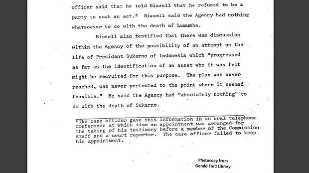 Dalam dokumen tahun 1975, Wakil Direktur Perencanaan CIA saat itu, Richard Bissell, memberikan kesaksian bahwa ada pembahasan di dalam badan itu tentang upaya 'atas kehidupan Presiden Indonesia Sukarno yang perkembangannya sejauh identifikasi dari satu aset yang mungkin direkrut untuk tujuan ini'.