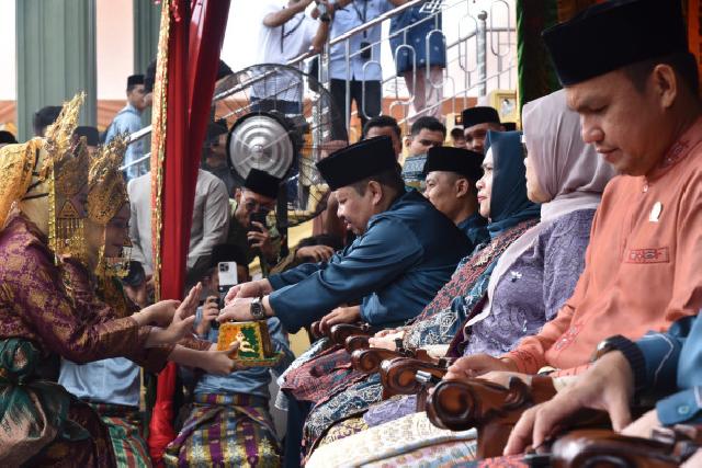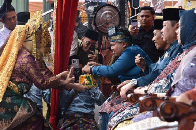 Wakil Ketua DPRD Kabupaten Bengkalis, Muhammad Arsyad Fadillah mengambil sirih yang diserahkan penari persembahan